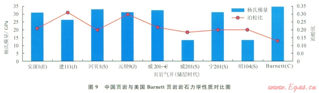 在地質(zhì)特征上,作為有勘探開發(fā)遠景的含氣頁巖儲層既要有產(chǎn)氣潛力大的物質(zhì)基礎(chǔ)——高質(zhì)量儲層(RQ),也要是能進行有效壓裂的目標——良好的鉆完井地層(CQ)。有機質(zhì)含量高的富含有機質(zhì)頁巖是在特殊條件下形成的[2],這種特殊的條件使得所有頁巖氣儲層都有其獨特性(圖7) [6-7],即便是同一套頁巖儲層的地質(zhì)特征在縱橫向上也往往會有非常明顯的變化。每一頁巖儲層要實現(xiàn)工業(yè)化規(guī)模開發(fā)都需要花費一定的時間對其地質(zhì)特征進行認識,摸索適應(yīng)的工程技術(shù)。從對比研究的結(jié)果可知,與北美地臺頁巖氣儲層相比,中國頁巖氣形成與富集地質(zhì)條件非常復(fù)雜,除頁巖沉積總面積可能相當外,其他條件都相差較遠。美國產(chǎn)氣頁巖主要是海相沉積,而中國除海相頁巖外,還有較為發(fā)育的海陸過渡相和陸相頁巖(圖8)。美國頁巖氣主要產(chǎn)白上古生界一中生界,中國白元古界到新近系都有頁巖發(fā)育[1]。美國頁巖熱(R。)為1.0%~3.5%,處在生氣高峰期,中國海相頁巖R。為2.3%~5.1%,為高——過成熟熱裂解成氣階段,陸相頁巖R。為0.4%~l.2%,處于低熟一成熟階段,以生油為主,局部生氣。北美地臺構(gòu)造穩(wěn)定,斷裂少,頁巖自沉積、成巖、成氣以來,除有一定抬升外,很少有大的構(gòu)造改造,中國構(gòu)造背景總體處在活動性較強的區(qū)域,斷裂發(fā)育,大部分頁巖都經(jīng)歷了強烈的后期多次改造,南方海相頁巖大面積出露。另外,從圖9中可明顯看出,中國頁巖儲層楊氏模量較低、泊松比高,巖石脆性指數(shù)低于美國頁巖儲層,可壓性差。