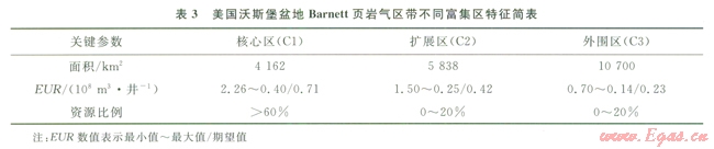 更為重要的是每一個成功的頁巖氣田從發(fā)現(xiàn)到工業(yè)化規(guī)模開發(fā)都需要經(jīng)歷“點上發(fā)現(xiàn)、面上評價、落實核心區(qū)、拓展規(guī)模開發(fā)”4個階段。與常規(guī)油氣資源勘探開發(fā)不同,頁巖氣首先是在遠景區(qū)帶評選的基礎(chǔ)上,通過l~2口或更多一點的鉆井工作,驗證貞巖氣的存在,實現(xiàn)點上發(fā)現(xiàn);再以數(shù)口至數(shù)10口評價井鉆探,對整個頁巖氣區(qū)帶開展面上評價,落實資源規(guī)模,分析資源分布規(guī)律,劃分不同資源豐度富集區(qū);隨后進行富集區(qū)綜合評價,開展先導試驗井鉆探,評價單井產(chǎn)能,總結(jié)高產(chǎn)富集規(guī)律,確定核心區(qū);最后以核心區(qū)為重點,實現(xiàn)工業(yè)化規(guī)模開發(fā),以此為基礎(chǔ)逐漸拓展,最終實現(xiàn)頁巖氣區(qū)帶整體開發(fā)。頁巖氣形成與富集機理特殊,一般大面積連續(xù)分布,資源富集程度總體較低,核心區(qū)為資源相對富集區(qū)。一個頁巖氣區(qū)帶中,核心區(qū)范圍不大,但所擁有的資源可占整個頁巖氣區(qū)帶的60%以上[6-7](表3),單井最終可采儲量(EUR)高,核心區(qū)內(nèi)的頁巖氣井中的干井、低產(chǎn)井比例不足4%。因此,核心區(qū)的確定成為一個頁巖氣區(qū)帶成功的關(guān)鍵。中國頁巖氣勘探開發(fā)處于起步階段,資源潛力尚未完全落實,遠景頁巖氣區(qū)帶尚未確定,核心區(qū)的確定目前更無從談起。