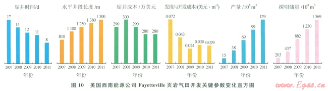 頁巖氣本身是潔凈能源,毋庸置疑,但頁巖氣在勘探開發(fā)巾會引發(fā)嚴重的環(huán)境污染問題也不應(yīng)回避。美國有輿論指出頁巖氣開采已產(chǎn)生了明顯的環(huán)境污染,在美國的一些地方,已爆發(fā)多起抗議由頁巖氣勘探開發(fā)導致的水源污染、房屋損害等事件。歐洲因擔心頁巖氣勘探開發(fā)存在環(huán)境隱患而叫停了多個頁巖氣項目,越來越多的國家正在由于對環(huán)境的擔憂而不鼓勵頁巖氣發(fā)展[13]。頁巖氣勘探開發(fā)可能造成的環(huán)境污染包括勘探開發(fā)中大量占有土地對地表的破壞、大量鉆井液與壓裂液的用水與排放對水資源的過度使用與污染(表5)、烴類氣體遺散及其他有害物質(zhì)的排放對大氣及土地等的污染。大量占有土地、鉆井液與壓裂成功實現(xiàn)了頁巖氣大規(guī)模商業(yè)性開采。據(jù)美國西南能源公司2007—2011年對Fayetteville頁巖氣區(qū)帶的開發(fā)統(tǒng)計,通過不斷的技術(shù)進步和優(yōu)化作業(yè)流程,鉆井時間減少了52%以上,水平井段長度增加了84%以上,產(chǎn)量、儲量均提高了7倍以上,但鉆井成本基本保持不變,發(fā)現(xiàn)和開發(fā)成本大幅度降低(圖10) [2],盡管如此,該區(qū)帶所有頁巖氣井,仍有80%處于虧損或無利可盈狀態(tài),只有20%的井有盈利狀態(tài)。中國頁巖氣勘探開發(fā)剛駛?cè)斯I(yè)化試驗發(fā)展道路,以地質(zhì)評價、資源落實、技術(shù)積累為主,頁巖氣鉆井、儲層改造技術(shù)還不成熟,工具、工藝不配套,特別是施工工具、裂縫監(jiān)測等工具與技術(shù)尚需進口,同時,盡管中國的天然氣市場需求旺盛,但管網(wǎng)建設(shè)還不成熟且分布不均,使中國頁巖氣液的用水在中國將是更為嚴峻的環(huán)保挑戰(zhàn)。在中國南方地少人多、地貌以丘陵、山地為主,頁巖氣井場往往會臨近村舍,人口密集,且取水、排液主要以灌溉及飲用水源為主,這將使得頁巖氣在鉆井、儲層改造中面臨嚴峻的噪音消除、鉆井液與壓裂液處理及交通設(shè)施協(xié)調(diào)的壓力。大量土地占有,會造成地表植被破壞,大規(guī)模水力壓裂會破壞巖層穩(wěn)定性,二者并存將會增加山體滑坡發(fā)生的町能性。在中國北方,尤其是兩北地區(qū),干旱缺水現(xiàn)象較為突出,在較短的時間內(nèi)消耗大量的水,會給當?shù)厝诵笥盟凸I(yè)用水帶來影響。另外,水力壓裂中大量消耗和陶粒、石英砂及KC1等也是寶貴的天然資源。
