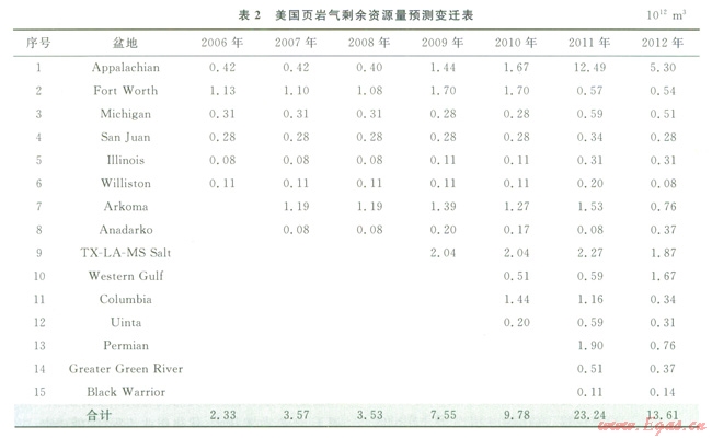 初步研究結(jié)論指出(圖8),中國南方地區(qū)、華北地區(qū)、新疆塔里木盆地、西藏羌塘盆地發(fā)育海相頁巖,南方地區(qū)、華北地區(qū)、新疆地區(qū)發(fā)育海陸過渡相—湖沼相煤系頁巖,松遼盆地、渤海灣盆地、鄂爾多斯盆地、四川盆地等發(fā)育湖相頁巖,上述3類頁巖都具備頁巖氣形成與富集的條件。國內(nèi)外專家預(yù)測:中國頁巖氣資源非常豐富,或許超過常規(guī)天然氣資源量(圖5、表l)。實際上,中國到底會有多少頁巖氣資源,從目前國內(nèi)流行的多版本資源數(shù)據(jù)就可見一斑,每個預(yù)測數(shù)據(jù)看似依據(jù)都很充分,但實際又都不可信,關(guān)鍵緣由是目前中國頁巖氣資源預(yù)測的基礎(chǔ)非常差。美國是在經(jīng)歷了數(shù)l0年頁巖氣勘探開發(fā)實踐的基礎(chǔ)上,才逐步解決了頁巖氣資源問題,其頁巖氣資源量估算基礎(chǔ)是建立在工業(yè)化規(guī)模開發(fā)的9大頁巖氣區(qū)帶、近60 000口頁巖氣生產(chǎn)井、近30年頁巖氣規(guī)模生產(chǎn)經(jīng)驗上,采用了單井(生產(chǎn))最終可采儲量法。即便是如此,美國的頁巖氣資源量在不同經(jīng)濟、技術(shù)條件下,仍然還會隨時有較大的變化(表2) [14]。