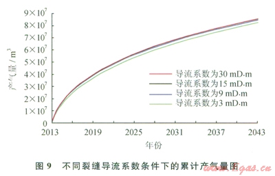 體積壓裂形成的裂縫體系是否具有經(jīng)濟(jì)效益,一個(gè)很重要的指標(biāo)是裂縫的導(dǎo)流能力,因此頁巖氣藏的開發(fā)不僅僅依靠復(fù)雜的裂縫網(wǎng)絡(luò)系統(tǒng),還需要裂縫有充分的導(dǎo)流能力。圖9展示了不同裂縫導(dǎo)流系數(shù)條件下的累計(jì)產(chǎn)氣量對(duì)比情況,表7中給出了具體的累計(jì)產(chǎn)氣量,從該圖9和表7中的數(shù)據(jù)可以看出主裂縫導(dǎo)流系數(shù)對(duì)模型的采出程度有較大影響,在其他條件都相同時(shí),提高壓裂形成主裂縫的導(dǎo)流能力,可明顯提高頁巖氣藏的采收率。這里需要指出的是,雖然增大裂縫的導(dǎo)流系數(shù),是提高采收率的途徑之一,但從圖9中可以看出,隨著導(dǎo)流系數(shù)的不斷增大,累計(jì)采氣量的增幅越來越小,對(duì)于本文中的數(shù)值模型,當(dāng)裂縫導(dǎo)流系數(shù)達(dá)到9mD·m后,進(jìn)一步增加裂縫的導(dǎo)流能力并不能顯著地提高氣藏的采出程度。