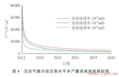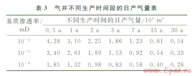 頁巖氣抬在投產(chǎn)初期產(chǎn)氣量較高但遞減迅速,后期相當(dāng)長(zhǎng)時(shí)間內(nèi)產(chǎn)量低,遞減緩慢,因此氣井的壽命比常規(guī)氣藏的氣井也要長(zhǎng)得多。圖4中模擬了基質(zhì)滲透率分別為l×10-4mD、1×l10-5mD和1×10-6mD 3種情況下分段壓裂水平井的產(chǎn)量遞減曲線,氣井均以8×103m3的日產(chǎn)氣量投產(chǎn),井底壓力控制為3MPa,表3中給出了不同生產(chǎn)時(shí)間的日產(chǎn)氣量。從圖4和表3不難看出,頁巖氣井在生產(chǎn)初期的產(chǎn)量遞減異常顯著,根據(jù)國外的頁巖氣藏?cái)?shù)據(jù)資料統(tǒng)計(jì),頁巖氣井在投產(chǎn)的第1年內(nèi)產(chǎn)量遞減最高在80%以上,以后遞減逐漸減緩。
