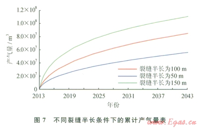 頁巖儲(chǔ)層的體積壓裂改造,通過多方向人丁縫裂溝通更多的天然裂縫,增加泄流面積。圖7和圖8分別模擬了不同裂縫半長(zhǎng)和不同裂縫間距條件下的單井模型累計(jì)產(chǎn)氣量的對(duì)比情況,表5和表6分別給出了具體的累計(jì)產(chǎn)氣量。結(jié)合圖7和表5、圖8和表6可以看出,當(dāng)體積壓裂形成的主裂縫較短或分段壓裂的級(jí)數(shù)較少時(shí),增加主裂縫的長(zhǎng)度和分段壓裂的級(jí)數(shù)都可以使累計(jì)產(chǎn)氣量顯著提高。但從模擬結(jié)果來看,當(dāng)裂縫半長(zhǎng)超過l00m后,再繼續(xù)增加裂縫的長(zhǎng)度,累計(jì)產(chǎn)氣量的增幅越來越小,同樣隨著分段壓裂級(jí)數(shù)的增加,累計(jì)產(chǎn)氣量的增幅也是越來越小的。