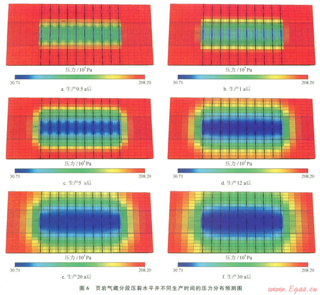 頁巖儲(chǔ)層的滲透率極低,一般都要經(jīng)過大規(guī)模體積壓裂,在氣井周圍形成復(fù)雜的裂縫網(wǎng)絡(luò)體系,頁巖氣井才能獲得工業(yè)氣流。圖6展示了上述模型中分段壓裂水平井生產(chǎn)不同時(shí)間后的壓力分布情況,在分段壓裂水平井投產(chǎn)初期,首先采出的是壓裂形成的主裂縫中的游離氣,進(jìn)而采出整個(gè)儲(chǔ)層改造區(qū)域(SRV)內(nèi)的游離氣,當(dāng)生產(chǎn)1a左右時(shí)間后,壓力波及廠SRV區(qū)域的邊緣。在此之前一直是體積壓裂改造形成的裂縫網(wǎng)絡(luò)系統(tǒng)向氣井供氣,因此氣井的產(chǎn)量遞減迅速,這與圖4中的產(chǎn)量遞減現(xiàn)象是相吻合的。隨著生產(chǎn)時(shí)間,氣井形成的壓降漏斗隨之增大(圖6),儲(chǔ)層未被改造到的區(qū)域開始向氣井供氣,隨著游離氣的逐漸采出,儲(chǔ)層中壓力降低,吸附氣開始解吸附(圖5)。頁巖氣井后期的產(chǎn)量雖然較低,但是相對(duì)穩(wěn)定。從圖6-d~f中大致可以看出,當(dāng)氣井生產(chǎn)足夠長(zhǎng)時(shí)間后,壓力波及范圍已基本不變,單井控制范圍較小,只能靠增加水平井的數(shù)量來提高整個(gè)氣藏的采出程度。
