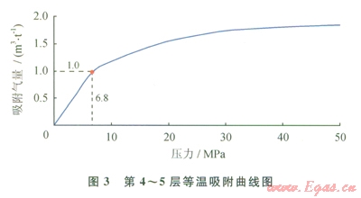 模型中吸附氣的解吸遵循Langmuir等溫吸附定律(表2),縱向上由頂?shù)降祝?span lang="EN-US">l~3層的等溫吸附曲線見圖2,第4~5層的等溫吸附曲線見圖3。模型的儲(chǔ)量為9.92×108m3,總含氣量為2.57m3/t,其中游離氣占總含氣量的58%,吸附氣占總含氣量的42%。