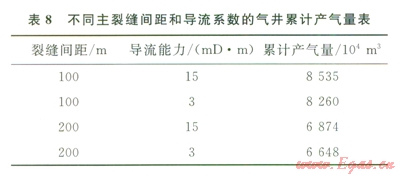 根據(jù)上述分析,只有壓裂縫具有一定的導(dǎo)流能力時(shí),才可能成為對(duì)氣藏開發(fā)有效的裂縫,而且壓裂縫的導(dǎo)流能力越強(qiáng),裂縫周圍儲(chǔ)層中的流體就越容易往裂縫中流動(dòng),進(jìn)而流入井筒中,因此裂縫導(dǎo)流能力的強(qiáng)弱對(duì)于分段壓裂的級(jí)數(shù)具有重要影響。如果能夠壓裂出相對(duì)高導(dǎo)流能力的裂縫,那么高導(dǎo)流裂縫之間間距的影響就會(huì)減小。相反,如果不能壓裂出相對(duì)高導(dǎo)流裂縫,則通過增加壓裂的級(jí)數(shù)來減小主要的高導(dǎo)流裂縫間的間距也會(huì)本質(zhì)上提高產(chǎn)氣速率和氣藏采收率(圖10、表8)。另外,相對(duì)高導(dǎo)流能力的裂縫,不僅可以大幅度的提高產(chǎn)量,還可以減少壓裂的級(jí)數(shù),減少成本,提高開采的效益。