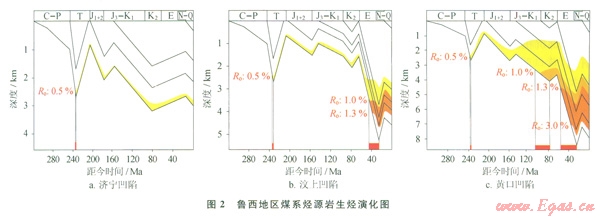 白上古生界煤系烴源巖沉積以后,因該區(qū)覆于穩(wěn)定的華北地臺之上,接受的沉積厚度相差不大(2500m左右),各地區(qū)地溫梯度基本相同,煤系烴源巖的R。達到0.5%左右,開始少量生烴。三疊紀(jì)末期受印支運動影響,該區(qū)大規(guī)模抬升[12-15],有機質(zhì)演化得到抑制。此后,凹陷區(qū)進入差異演化階段,導(dǎo)致地溫梯度也開始分異:黃口、成武、魚臺等凹陷因接受大規(guī)模的中生界沉積,煤系烴源巖埋深超過3500m,開始二次生烴;此時的汶上、濟寧、巨野等凹陷中生界沉積厚度較薄、埋藏較淺,烴源巖未能滿足液態(tài)烴生烴條件。