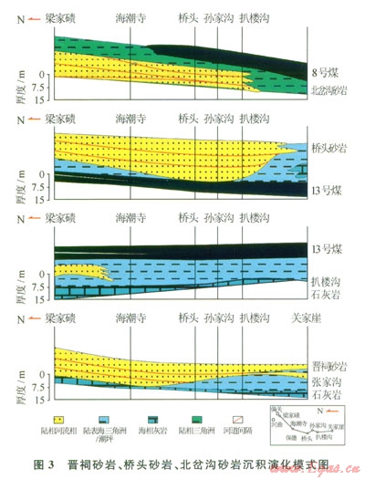 扒樓溝石灰?guī)r沉積時(shí)期的海侵之后,在濱海平原和潮坪環(huán)境的基礎(chǔ)上開始泥炭沼澤化沉積,聚煤場(chǎng)所隨著海水的后退而不斷拓展,形成厚層泥炭堆積,形成了太原組主力煤層l3號(hào)煤層,是整個(gè)河?xùn)|煤田穩(wěn)定發(fā)育的煤層。橋頭砂巖的展布范圍較晉祠砂巖略廣,在北部以河道沉積為主,在魏家灘以南,過渡為向上變粗層序,屬三角洲前緣砂,部分地段見分流河道砂[1]。