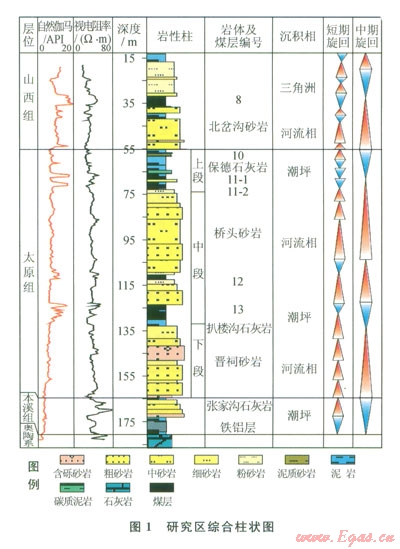 山西組以河流三角洲沉積體系為主,底界北岔溝砂巖,是一套灰白色的粗粒砂巖,與下伏地層呈整合接觸,厚度變化大,局部底部含礫,在橋頭鎮(zhèn)一帶過渡為細(xì)礫巖??梢娪缮皫r、粉砂巖、碳質(zhì)泥巖及煤層組成2~4個(gè)正粒序的沉積旋回。主采煤層為8號(hào)煤層,發(fā)育在第一旋回的上部,大部分地區(qū)穩(wěn)定可采(圖1)。