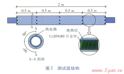 測(cè)試段為有效加熱長度為2m的半硬態(tài)水平光滑銅管(見圖2),內(nèi)直徑為4mm,外直徑為6mm,在測(cè)試段進(jìn)口、出口分別安裝壓力、溫度傳感器。在測(cè)試段每隔0.5m安裝熱電偶,以測(cè)量銅管外壁溫度,熱電偶用絕緣膠布固定在銅管外壁。電加熱絲采用直徑為045mm的Cr20Ni80合金絲,總電阻為82.5Ω,用于模擬蒸發(fā)器負(fù)荷。最外層設(shè)置絕熱層,起到固定和絕熱作用。電加熱絲與調(diào)壓器相連接,通過調(diào)節(jié)直流電壓來調(diào)節(jié)電加熱功率,改變測(cè)試段熱流密度。測(cè)試段熱流密度q的計(jì)算式為: