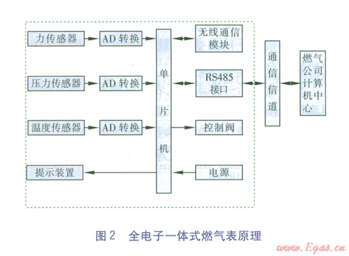 壓力傳感器、溫度傳感器、力傳感器的模擬信號經(jīng)AD轉(zhuǎn)換后傳給單片機,單片機加以處理后發(fā)送給提示裝置(液晶屏、發(fā)光管和蜂鳴器)以提示用戶,并可向控制閥發(fā)出指令以實現(xiàn)通斷功能。通過通信接口(RS485)將計量數(shù)據(jù)通過通信信道發(fā)送到燃?xì)夤镜挠嬎銠C中心,或通過無線通信模塊以無線傳輸?shù)姆绞桨l(fā)送到燃?xì)夤镜挠嬎銠C中心,并接受計算機中心發(fā)出的指令實現(xiàn)控制功能。全電子一體式燃?xì)獗碓硪妶D2。