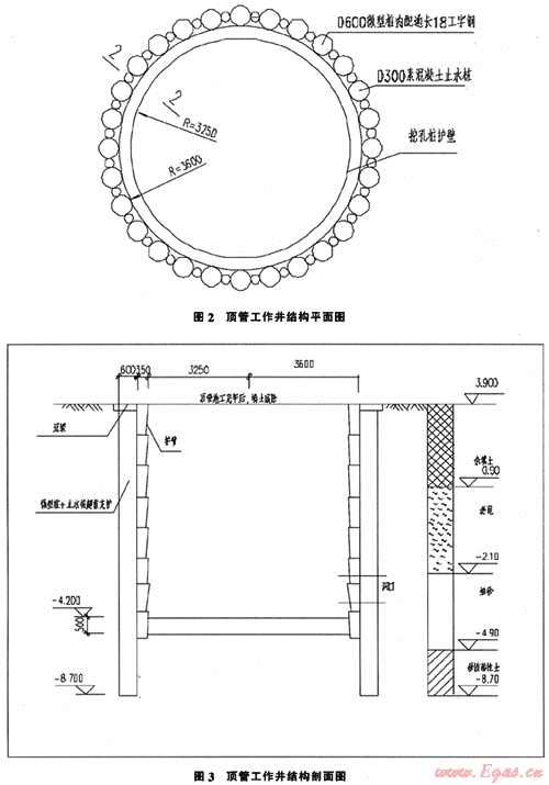 工作難點(diǎn):由于頂管洞口開(kāi)口部位位于細(xì)砂層中,若直接在井壁開(kāi)口將會(huì)有大量泥沙涌人作業(yè)井,引發(fā)地面塌陷。解決辦法:開(kāi)口前。在支護(hù)結(jié)構(gòu)外圍施工兩排注漿孔,共17孔,采用袖閥管注漿法加固洞口外圍砂層,止水防滲。加固結(jié)構(gòu)見(jiàn)圖4。開(kāi)口后洞口采用砌磚封門(mén)。