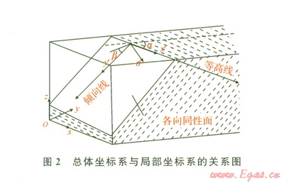在實(shí)際工程中,由于地層存在一定的走向和傾角,通常和上述坐標(biāo)系不一致,如圖2所示。需要選用總體坐標(biāo)系(x,y,z)??傮w坐標(biāo)系(x,y,z)和各向異性定向坐標(biāo)系(x',y',z')的關(guān)系可通過(guò)走向角(α)和傾向角(α)建立。