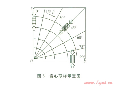 為探討層理頁(yè)巖的各向異性,按一定的β方向取樣(β角為層理而與巖樣端面問(wèn)的夾角)。β角從0°~90°,每隔l5°取l個(gè)樣,共計(jì)7個(gè)樣(圖3)。巖樣上下端面的不平行度小于