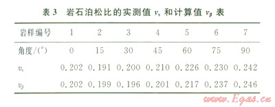 從表3可以看出,泊松比的實(shí)測(cè)值與計(jì)算值也比較接近,誤差在合理的范圍內(nèi),所以將層理巖石視為橫觀各向同性介質(zhì)來(lái)計(jì)算泊松比是可行的。定義頁(yè)巖的各向異性指數(shù)e為: