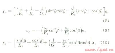由于在β=45°情況下,v2E1=vlE2,可得與z軸為任意角度β方向的彈性模量Eβ和泊松比vβ: