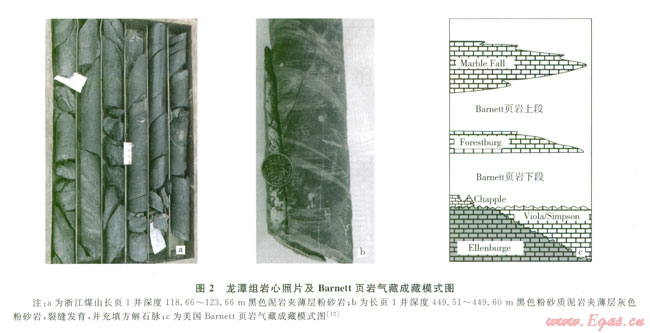 從表l中可以看出,龍?zhí)督M頁巖的TOC、R0、厚度以及地層的頂?shù)钻P系都較Lewis頁巖有更好的頁巖氣前景,而且從地層的頂?shù)钻P系來看(表1),與美國Barnett頁巖所處的地層格局(圖2-c)有很大的相似性,有利于頁巖氣的后期保存。