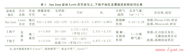 揚子地區(qū)龍?zhí)督M頁巖與美國San Juan盆地Lewis頁巖的沉積環(huán)境十分相似,故將各類參數(shù)進行對比總結(表1)。