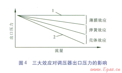 理想的調(diào)壓器在正常工作的流量范圍內(nèi)均應(yīng)保持出口壓力為定值,如圖4的曲線1所示。但是由于薄膜效應(yīng)、彈簧效應(yīng)和殼體效應(yīng)的綜合作用,調(diào)壓器的出口壓力隨著流量的增加,以一定的速率逐漸降低。調(diào)壓器僅受薄膜效應(yīng)、彈簧效應(yīng)和殼體效應(yīng)影響時(shí)的實(shí)際出口壓力如圖4的曲線2所示。