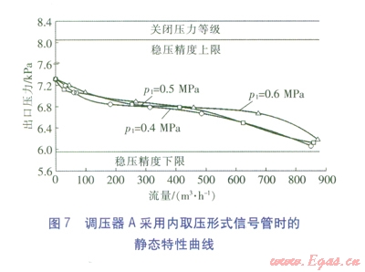 對(duì)于三大效應(yīng)不顯著的調(diào)壓器(如調(diào)壓器A),若能夠避開(kāi)壓力恢復(fù)區(qū)的影響,即可防止信號(hào)管壓力與調(diào)壓器出口管道壓力存在如圖9所示的較大負(fù)偏差,進(jìn)而可以防止調(diào)壓器出口壓力隨流量的增大而陡增的現(xiàn)象:當(dāng)調(diào)壓器A采用外取壓形式的信號(hào)管或采用內(nèi)取壓形式的信號(hào)管(設(shè)置方式同3.3中①)時(shí),均具有良好的靜態(tài)特性,調(diào)壓器出口壓力設(shè)定值為7.O0kPa時(shí)的靜態(tài)特性曲線如圖6、7所示。