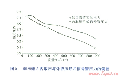 圖5為調(diào)壓器A在入口壓力為0.6 MPa,出口壓力設(shè)定值為7.00 kPa工況下,內(nèi)取壓形式信號(hào)管壓力與外取壓形式信號(hào)管壓力(出口管道實(shí)際壓力)隨流量的變化。