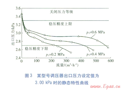 圖3中,橫軸為管道流量,縱軸為調(diào)壓器的出口壓力。圖3所示的靜特性曲線族為調(diào)壓器出口壓力設(shè)定值為3.O0 kPa條件下,調(diào)壓器的進(jìn)口壓力分別為0.2,0.4和0.6 MPa時(shí),調(diào)壓器實(shí)際出口壓力隨流量變化的曲線。