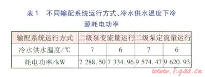 不同輸配系統(tǒng)運(yùn)行方式、冷水供水溫度下冷源耗電功率見(jiàn)表l。當(dāng)冷水供水溫度為
