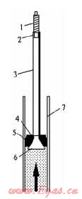 (圖:1-螺桿;2-螺母;3-作用套管;4-作用墊片;5-堵漏膠圈;6-作用椎體;7-燃氣管道;箭頭指示為來氣方向)