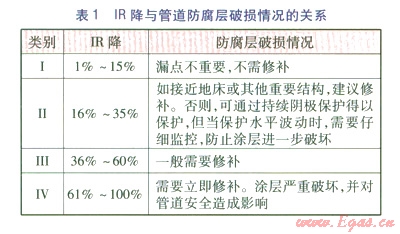 IR降越大,陰極保護(hù)程度越低,即埋地管道防腐層缺陷面積越大,可見DCVG能夠較準(zhǔn)確地預(yù)測(cè)防腐層缺陷的面積,并能對(duì)整個(gè)管道的陰極保護(hù)效果做出客觀的判斷。IR降與防腐層破損情況的關(guān)系見表1。