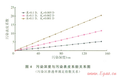 通過式(10)可以算出在不同污染深度下的表皮系數(shù)。其污染深度與污染表皮系數(shù)關(guān)系(l=1 50 cm,K=0.1 D)見圖4。從圖4可知污染表皮系數(shù)隨著污染深度的增加而增大。