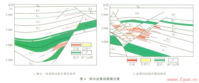 屬于斷裂帶下部生烴層系油氣藏的油氣成藏模式類型。這些油氣藏油氣來源多樣,既有自生自儲的油氣也有由洼陷側(cè)向運移來的油氣。以中央隆起帶鹽間地層為代表(圖7)。該成藏模式具有如下特點:①主要由沙三中、下亞段2套烴源巖供烴;②以側(cè)向運移為主,自生自儲為輔;③圈閉類型主要為斷塊圈閉;④運移動力主要是超壓;⑤縱向上油氣分布較為集中。