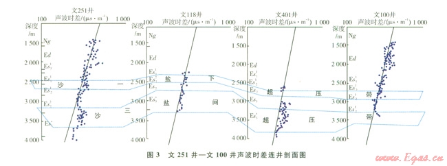 文251井-文100井剖面橫跨西部洼陷、文留主體和東部洼陷,在文留主體和兩側(cè)洼陷斜坡帶發(fā)育沙三2鹽、沙三4鹽和沙一鹽。從聲波時差對比剖面圖(圖3)上可以看出,西部洼陷斜坡帶的文251井、東部洼陷斜坡帶的文100井、文留主體的文118井,以及新文401井主要發(fā)育沙三鹽間超壓帶和沙一鹽下超壓帶,在橫向上具有較好的對比性,且沙三鹽間超壓帶的超壓幅度明均大于沙一鹽下超壓帶,東、西洼陷斜坡帶的超壓幅度均大于文留主體,說明在異常壓力的動力下,洼陷區(qū)生成的油氣可以向構(gòu)造主體運移,也可以由沙三段向淺部的沙二段和沙一段運移。