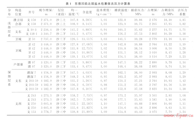 表l是對東濮凹陷中央隆起帶北部多口井不同層段鹽水包裹體捕獲壓力的計算結(jié)果。分析表明,研究區(qū)深部層系流體包裹體古剩余壓力和古壓力系數(shù)較高,其中衛(wèi)城南部、戶部寨、文東等地區(qū)沙三中、下亞段古剩余壓力為7.29~11.22 MPa,古壓力系數(shù)介于1.23~1.42,而且文東地區(qū)距離洼陷巾心較近的文203—59井的超壓幅度要高于距離洼陷中心較遠(yuǎn)的濮深7井,說明這些部位油氣的充注是在高壓系統(tǒng)內(nèi)完成的;文西地區(qū)沙三中弧段古剩余壓力為l.9~10.66MPa,古壓力系數(shù)為1.06~1.35,說明這些部位油氣的充注是在較高壓高壓系統(tǒng)內(nèi)完成的。