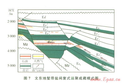 屬于鹽上油氣藏的油氣成藏模式類型。斷裂帶下部鹽間或鹽下地層中的砂體是油氣幕式運移的臨時倉儲層或“中轉(zhuǎn)站”,由于下部流體的超壓作用,這些砂體中的流體沿斷層周期性釋放而將油氣大量轉(zhuǎn)移到上部地層。主要發(fā)生于斷裂活動期,具有早期充注的特點,以衛(wèi)城地區(qū)向南至文留地區(qū)為代表(圖6)。該成藏模式具有如下特點:①具有沙三上、中、下亞段3套烴源巖供烴;②以垂向幕式運移為主、側(cè)向運移為輔;③圈閉類型主要為復(fù)雜斷塊圈閉;④運移動力主要是超壓;⑤縱向上烴類聚集層系沿主干斷裂呈羽狀分布。