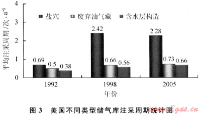 根據(jù)調(diào)研數(shù)據(jù)廢棄油氣藏儲氣庫注采周期一般1次/a,平均不足1次/a;含水層構(gòu)造儲氣庫注采周期一般1次/a,個別的會達到2次/a,如北美地區(qū)51座含水層構(gòu)造儲氣庫只有4座注采周期為2次/a,但平均不足1次/a。鹽穴儲氣庫至少1次/a,平均會達到2次/a。圖3給出的1998、1992和2005年美國在運不同類型儲氣庫注采周期統(tǒng)計。從中也可以看出鹽穴儲氣庫循環(huán)能力最好;廢棄油氣藏儲氣庫循環(huán)能力不斷提高。2005年鹽穴儲氣庫的平均注采周期為2.28次/a,枯竭型儲氣庫0.73次/a,水層型儲氣庫0.66次/a。