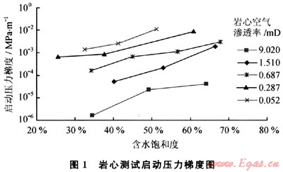 啟動壓力梯度定義為作用在流體上的壓差達到一定程度時,流體克服黏滯力開始流動時的壓力梯度。在低滲透氣藏中,氣體滲流是否存在啟動壓力梯度以及啟動壓力梯度產(chǎn)生的條件一直是石油工作者研究和爭論的焦點之一。持肯定觀點的學者認為天然氣在高溫高壓條件下與孔隙界面會產(chǎn)生一定的界面效應,或因為孔隙中水的存在而致使氣體滲流存在一定的啟動壓力梯度。持否定觀點的研究人員認為天然氣分子小,易于流動,在孔隙介質(zhì)中流動不存在啟動壓力梯度,如果說因為孔隙中含有一定飽和度的水而致使氣體在某些條件下不流動,應歸于兩相滲流的問題。筆者認為:啟動壓力梯度概念能較好的反映氣體流動的動態(tài)特征,綜合反應了儲層物性、含水及驅(qū)動壓力對氣體滲流的影響,在滲流方程中引入啟動壓力梯度,能更好地描述低滲儲層的滲流特征,確定氣井的有效動用范圍,為低滲氣藏開發(fā)井距的確定和井網(wǎng)優(yōu)化部署提供依據(jù)。根據(jù)實驗分析,同一物性巖樣,含水飽和度越大,啟動壓力梯度越大;巖石物性越差,啟動壓力梯度越大,并且受含水飽和度影響更顯著(圖1)。