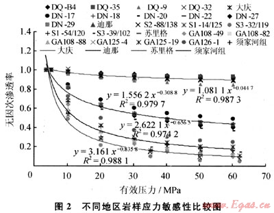 2) 低滲透儲層巖石在實驗分析中均表現(xiàn)出應力敏感特征,不同地區(qū)和不同巖石類型具有差異性,在實際生產(chǎn)中的儲層應力敏感性表現(xiàn)形式及其對開發(fā)的影響還需要深入研究。