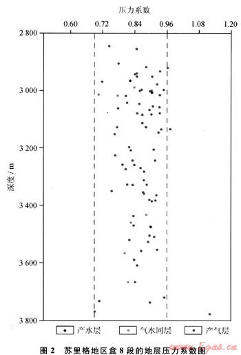 盒8段的原始地層壓力在22.5~42.5MPa。地層壓力總體上隨深度增加而呈線性升高,但地層壓力系數在縱向上缺乏明顯規(guī)律性。在2800~3800m的范圍內,無論是水層、氣層還是氣水同產層,地層壓力系數隨深度增加的變化都比較分散(圖2)。這表明區(qū)內異常低壓的分布不受埋深控制,而且與儲層孔隙流體相態(tài)之間也無直接聯(lián)系。