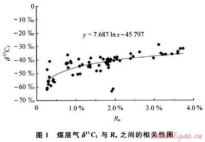 甲烷碳同位素值(δ13C1)特征是判識天然氣成因類型和演化程度的最有效的方法之一[1~5]。前人利用甲烷碳同位素來進行天然氣的演化和氣源、烴源巖的對比研究,認為:δ13C1隨著烴源巖成熟度的增大而逐漸變重,提出了煤型氣δ13C1與演化程度Ro之間關(guān)系的數(shù)學模型[6]。這些成果對于煤層氣δ13C1的研究具有一定的借鑒意義,但又不同于自生自儲的煤層氣。因此,煤層氣δ13C1的分布特征和分餾機理有待于進行進一步的分析。筆者通過對我國不同盆地、不同演化程度的煤儲層中產(chǎn)出的煤層氣樣品δ13C1實測值,在煤層氣物理模擬實驗的基礎(chǔ)上,研究煤層氣δ13C1的分餾效應(yīng)。