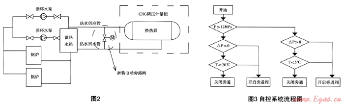 根據(jù)計(jì)算值,循環(huán)水供水溫度不低于21.9℃即可,因此時(shí)循環(huán)水溫度在46℃左右,為簡化控制流程,可在供回水管上設(shè)置一只等徑旁路閥,分流經(jīng)過換熱器的流量,并根據(jù)燃?xì)獬隹跍囟戎祦砜刂婆月烽y的開啟或關(guān)閉,以實(shí)現(xiàn)溫度的自動(dòng)控制。