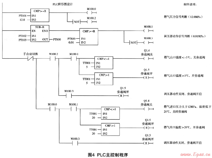 自動(dòng)系統(tǒng)需要4個(gè)開關(guān)量信號:燃?xì)膺M(jìn)口壓力開關(guān)信號(動(dòng)作值12MPa);二級調(diào)壓器前后差壓開關(guān)信號(動(dòng)作值0);燃?xì)獬隹跍囟刃盘?動(dòng)作值20℃);燃?xì)獬隹跍囟刃盘?動(dòng)作值5℃)。輸入開關(guān)量信號采用原系統(tǒng)自有的模擬量輸入信號(一級調(diào)壓器前壓力和燃?xì)獬隹跍囟?,通過PLC控制程序(比較模塊)實(shí)現(xiàn)3個(gè)開關(guān)量信號。輸出信號有2個(gè):旁通閥開啟信號,旁通閥關(guān)閉信號。