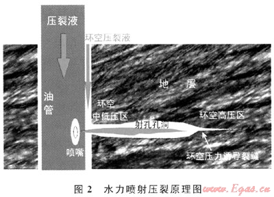 水力噴射壓裂是用高速和高壓流體攜帶砂體進(jìn)行射孔,打開(kāi)地層與井筒之間的通道后,提高流體排量,從而在地層中打開(kāi)裂縫的水力壓裂技術(shù)(圖2)。當(dāng)頁(yè)巖儲(chǔ)層發(fā)育較多的天然裂縫時(shí),如果用常規(guī)的方式對(duì)裸眼井進(jìn)行壓裂,大而裸露的井壁表面會(huì)使大量流體損失,從而影響增產(chǎn)效果。水力噴射壓裂能夠在裸眼井中不使用密封元件而維持較低的井筒壓力,迅速、準(zhǔn)確地壓開(kāi)多條裂縫。2005年,水力噴射壓裂技術(shù)第一次使用在美國(guó)Barnett頁(yè)巖中,作業(yè)者使用水力噴射環(huán)空壓裂工藝對(duì)Barnett頁(yè)巖中的53口井進(jìn)行了壓裂,其中26口井取得了技術(shù)和經(jīng)濟(jì)上的成功,有21口井被認(rèn)定為技術(shù)成功[4]。