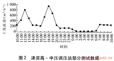 例如,津?yàn)I高-中壓調(diào)壓站有4臺(tái)型號(hào)為L(zhǎng)WQ-A-2500的渦輪流量計(jì),工況流量量程為125~2500m3/h,精度等級(jí)為1級(jí),運(yùn)行2臺(tái)。工況流量是指在管道介質(zhì)運(yùn)行壓力及溫度條件下的流量。從2009年8月4日10:00至8月5日10:00津?yàn)I高-中壓調(diào)壓站測(cè)試統(tǒng)計(jì)數(shù)據(jù)看,其計(jì)量表內(nèi)天然氣溫度為22.4~22.9℃,壓力為0.56~0.80MPa。18:00為用氣高峰,瞬時(shí)流量為948m3/h;而凌晨1:00—6:00為用氣低谷,瞬時(shí)流量為30m3/h左右。部分測(cè)試數(shù)據(jù)見圖2。