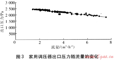 ② 調(diào)壓器出口壓力隨流量變化顯著,對于家用調(diào)壓器,為保證出口壓力不至于過低,應(yīng)控制其通過流量為理論最大流量的60%左右。對于25m3/h調(diào)壓器,因為其出口壓力可調(diào),通過流量范圍可適當放寬。