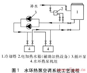 水環(huán)熱泵空調(diào)系統(tǒng)是用水環(huán)路將小型水源熱泵(水環(huán)熱泵機(jī)組)并聯(lián)在一起,構(gòu)成以回收建筑物內(nèi)部余熱為主要特征的供熱與供冷空調(diào)系統(tǒng)。這種系統(tǒng)要求建筑物內(nèi)部具有可回收的余熱,通過循環(huán)水將這些余熱分配到需熱區(qū)域,在不需要外界任何能量情況下,不同區(qū)域的水環(huán)熱泵機(jī)組可同時(shí)從循環(huán)水中取熱與放熱,實(shí)現(xiàn)同時(shí)供熱與供冷的效果。水環(huán)熱泵空調(diào)系統(tǒng)工藝流程見圖1。