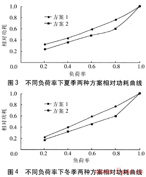 不同負(fù)荷率下夏季兩種方案相對功耗曲線見圖3,以夏季100%負(fù)荷率下的功耗作為計(jì)算基礎(chǔ)。由圖3可知,夏季,方案1的相對功耗與負(fù)荷率近似呈線性關(guān)系。方案2在負(fù)荷率為0.2~0.8范圍內(nèi),其相對功耗與負(fù)荷率也具有近似線性關(guān)系。在負(fù)荷率為0.8~1.0范圍內(nèi),其相對功耗發(fā)生劇烈變化,即負(fù)荷率為0.8是方案2相對功耗曲線的拐點(diǎn)。