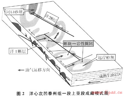 油氣成藏研究表明,白駒凹陷洋心次凹洋1、洋2、洋3等北西-南東向的斷層是在泰州組,阜寧組沉積完以后發(fā)育,三垛運(yùn)動(dòng)定型,其對(duì)泰一段上亞段的砂體沉積不起控制作用。但洋1斷層貫穿緩坡帶上的多個(gè)小砂壩,并與成熟生油區(qū)相連接,它將成熟生油區(qū)生成的石油,通過與其形成輸導(dǎo)網(wǎng)絡(luò)的次級(jí)斷層和砂體運(yùn)移到各個(gè)有利圈閉中,形成油藏,是開陽(yáng)等油藏的主要油源的運(yùn)移通道?,F(xiàn)有的白駒油區(qū)已發(fā)現(xiàn)的油藏均屬此類。
