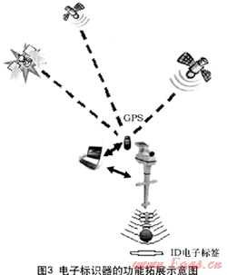 圖3是電子標識器的功能拓展示意圖,由GPS現(xiàn)場記錄電子標識器的經(jīng)度、緯度、海拔高度等信息,將數(shù)據(jù)上傳到電子地圖系統(tǒng),由此記錄標識器所在位置的絕對坐標[4]。
