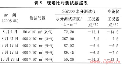 從實驗數(shù)據(jù)可以看出,儀器重復性滿足說明書技術指標要求,相對標準偏差較小,儀器的測量精度未受到天然氣中各種雜質的影響,運行可靠,能滿足現(xiàn)場在線測試的要求。在B站現(xiàn)場儀器與冷鏡法的比對數(shù)據(jù)見表5。