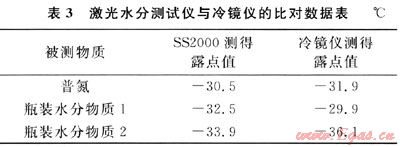 天然氣水分測試常用的測試技術有冷鏡法、電解法、Al2O3電容法和石英晶體法等[5]。在實驗室對SS2000激光水分測試法與冷鏡法進行了比對(冷鏡儀由中國測試技術研究院進行檢定),被測物質分別為普氮和瓶裝水分物質(補充氣為甲烷),濃度值與露點值之間的轉換采用ASTM1142標準,比對結果見表3。